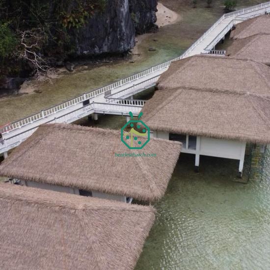 لتزيين سقف القش فوق الماء، بلاط سقف من القش النايلون حلول فعّالة للغاية من حيث التكلفة. يتميز بلاط قش النايلون بمتانته العالية للاستخدام في مناطق الشاطئ بفضل تركيبه الكيميائي. يتميز سقف قش النايلون بمظهره الناعم، مما يجذب انتباه عملائك إلى فندقك المنتجعي. في الوقت نفسه، يُعدّ لوح قش النايلون أكثر أمانًا بالنسبة لنا مقارنةً بمواد أسقف القش الطبيعية، حيث يُمكن أن يصل قش النايلون إلى درجة V0 في معظم المؤشرات وفقًا لمعيار اختبار مقاومة الحرائق UL 94-2013. ونظرًا لمزايا سقف قش النايلون المذكورة أعلاه، فهو فعّال من حيث التكلفة لتصميم سقف قش البنغل في فنادق المنتجعات.