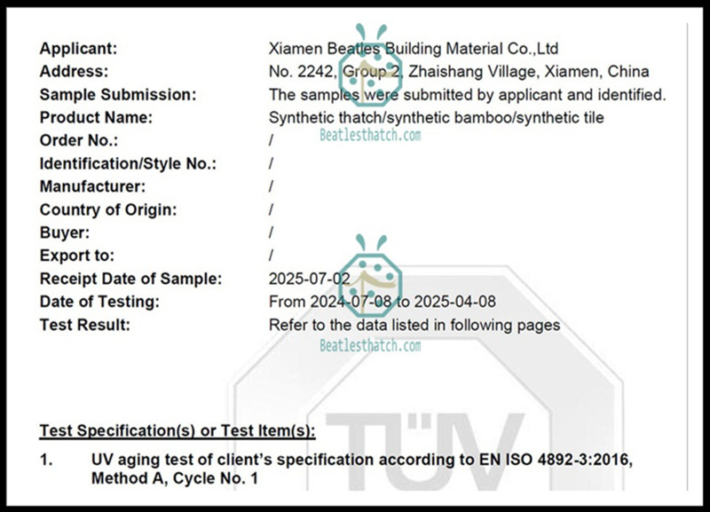 Our synthetic thatch roofing materials have passed the highly demanding EN ISO 4892 UV weathering test, with up to 5000 hours of accelerated UV exposure. This industry-recognized standard confirms the excellent UV resistance and color stability of our artificial thatch, ensuring long-term durability in tropical climates such as the Philippines.